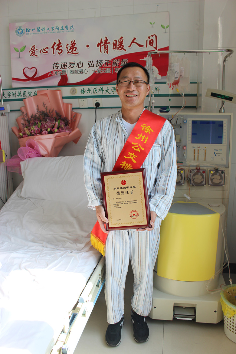 打過8針造血干細胞動員劑,10月30日上午開始采集?!袄习?,加油!”兒子在病床前給鄭剛鼓勁兒,雖然經過了幾天動員針的不適反應,此時鄭剛依舊很堅定:“我比別人的打針反應大,只要能救人一命,這都不算啥,我現(xiàn)在就希望孩子能盡快康復。”徐州市紅十字會副會長李永衛(wèi)為鄭剛頒發(fā)了“捐獻造血干細胞榮譽證書”,為他點贊:“你是英雄!”患者家人在感謝信中寫道:“您這種高尚的壯舉給了我們全家生活的希望?!?/span>