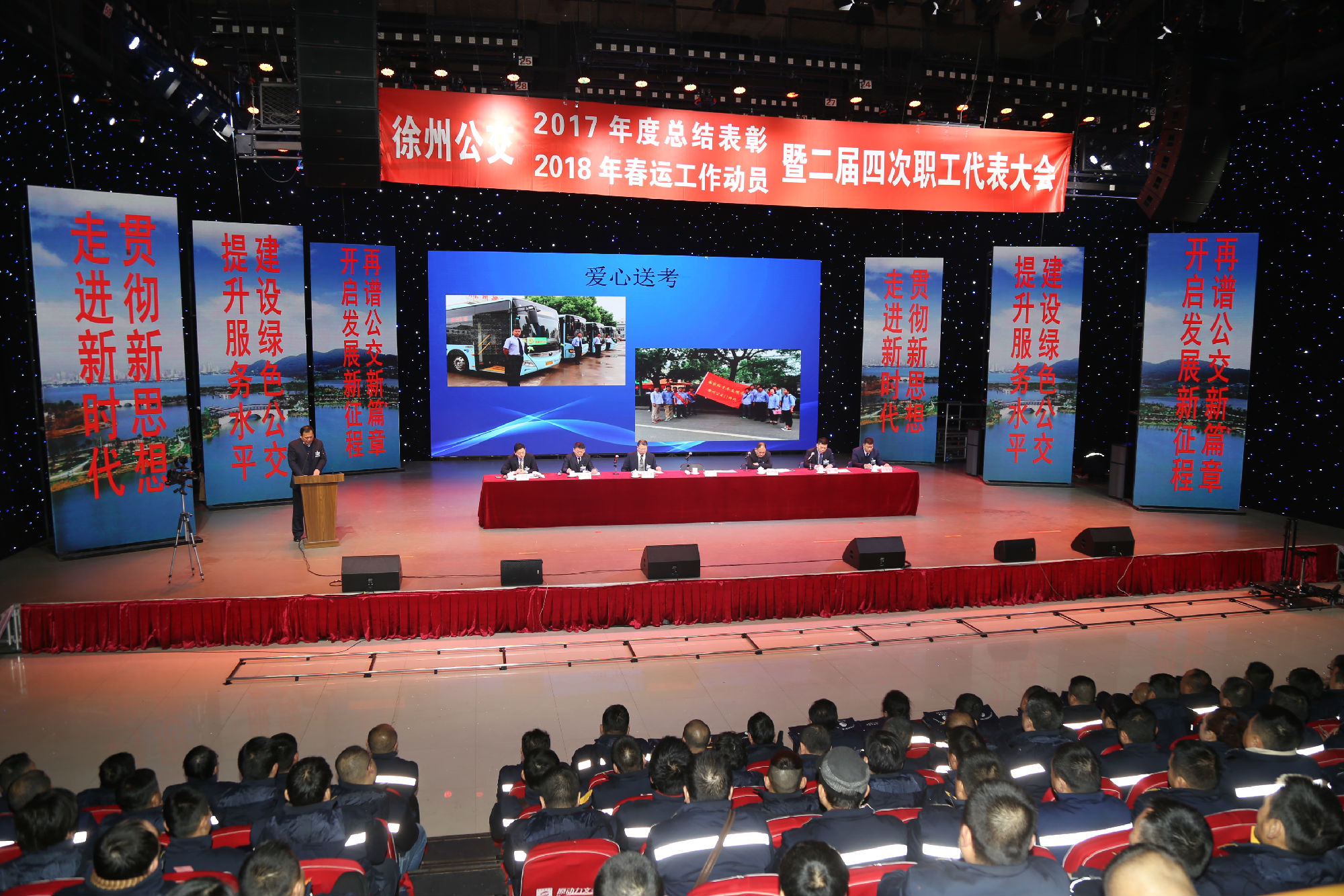 大會(huì)在莊嚴(yán)的國歌聲中拉開序幕。公司董事長、總經(jīng)理杜紅軍首先作經(jīng)理工作報(bào)告,對(duì)2017年“改革創(chuàng)新年”工作進(jìn)行了全面總結(jié):一、實(shí)施“同城同價(jià)”,優(yōu)化運(yùn)營管理,實(shí)現(xiàn)服務(wù)水平新突破。連續(xù)第五年面向全市征集線路線網(wǎng)優(yōu)化意見近3000條,據(jù)此新辟優(yōu)化線路29條。二、深化資源共享,在互聯(lián)網(wǎng)+企業(yè)管理上譜寫新藍(lán)圖。繼續(xù)深化集中維修,推行集中例檢。論證實(shí)施支付寶、微信、銀行卡閃付等智能化移動(dòng)支付方式。三、深化文明創(chuàng)建,打造優(yōu)秀公交,服務(wù)民生出行贏得新口碑。在國檢、省檢中未失一分,圓滿完成創(chuàng)建驗(yàn)收任務(wù)。投訴總數(shù)和有責(zé)投訴同比實(shí)現(xiàn)“雙下降”。乘客表揚(yáng)同比上升近20%。公司在2016年行風(fēng)熱線上線單位滿意度評(píng)議投票中名列榜首。率先打造公交行業(yè)禮讓斑馬線嶄新形象,圓滿完成公交反恐防暴工作。四、著力綜合管理,聚合內(nèi)生動(dòng)能,增強(qiáng)企業(yè)發(fā)展新優(yōu)勢(shì)。重新修訂2012版管理制度匯編和新版《徐州公交獎(jiǎng)懲條例》。五、踐行十九大精神,推進(jìn)和諧發(fā)展,開創(chuàng)黨群工作新面貌。接著,杜總分析了工作中存在的問題,提出下步工作重點(diǎn)。一、建設(shè)現(xiàn)代化公交,提升經(jīng)營管理水平,保障企業(yè)良性有序運(yùn)行;二、踐行集約共享理念,深化科技應(yīng)用,開創(chuàng)公交事業(yè)發(fā)展新局面;三、建設(shè)平安公交,提升服務(wù)口碑,展示文明公交新形象;四、踐行十九大精神,構(gòu)建和諧公交,開啟黨群工作新面貌。